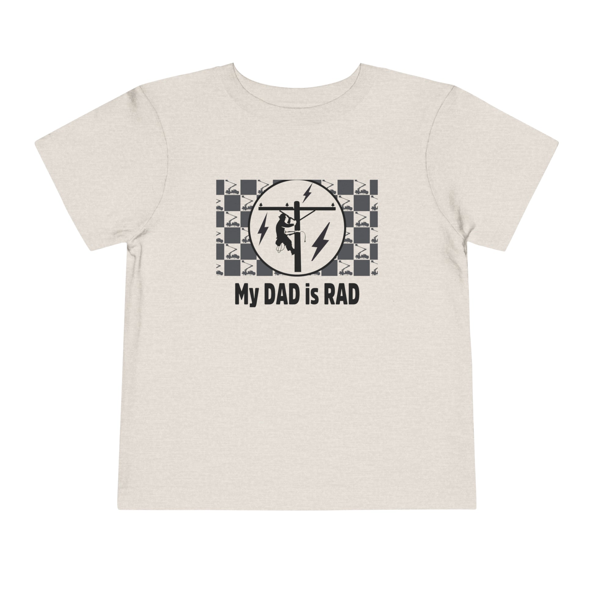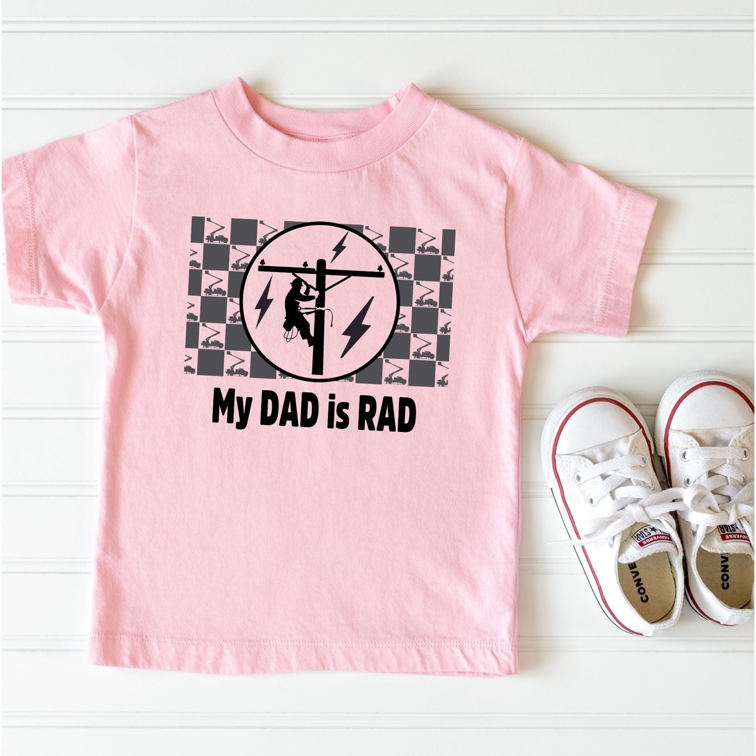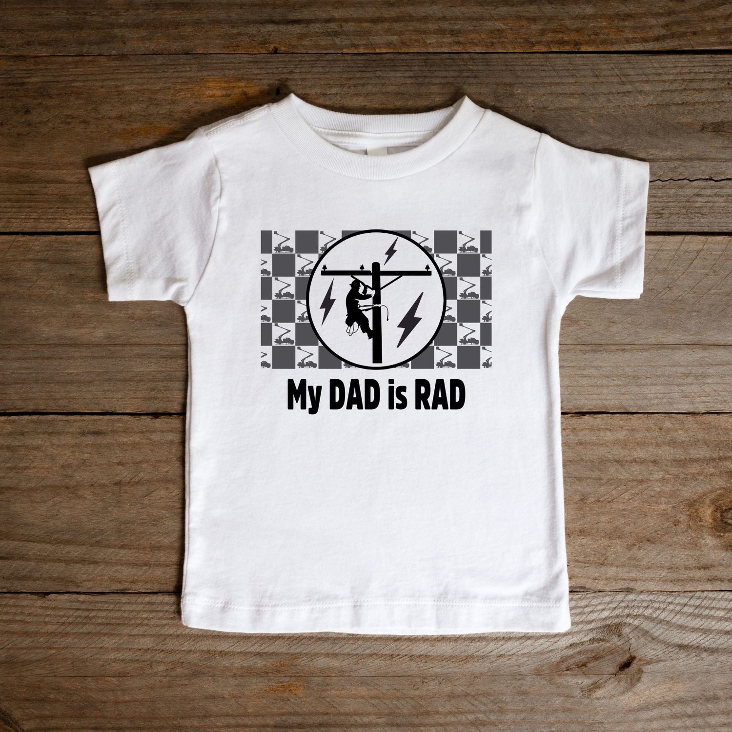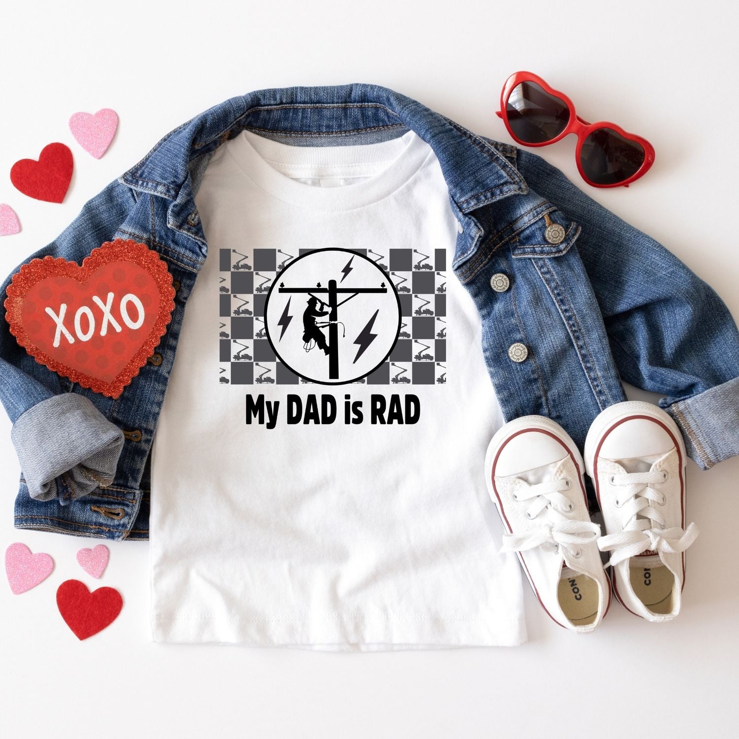 This special tee will allow a lineman toddler to show off his/her pride for his/her lineman dad. It comes with a checkered background that includes bucket trucks and a lineman and lightning bolts that will make any kid feel cool while wearing it.